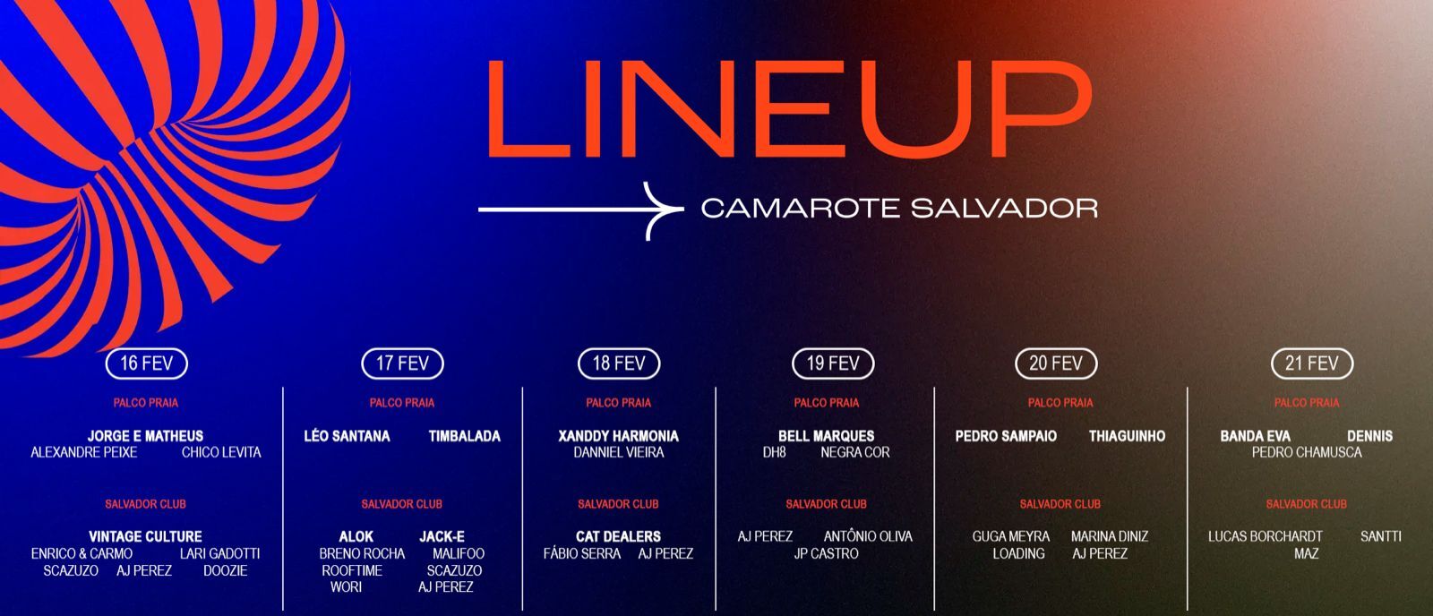 No Camarote Salvador você vai poder viver uma experiência completa dentro do melhor Carnaval do Mundo! As principais atrações da música brasileira e do eletrônico em 6 dias inesquecíveis, numa estrutura incrível com seleto público de todo o Brasil!
